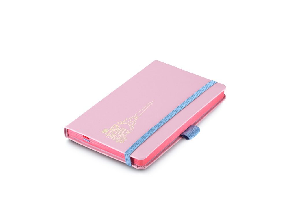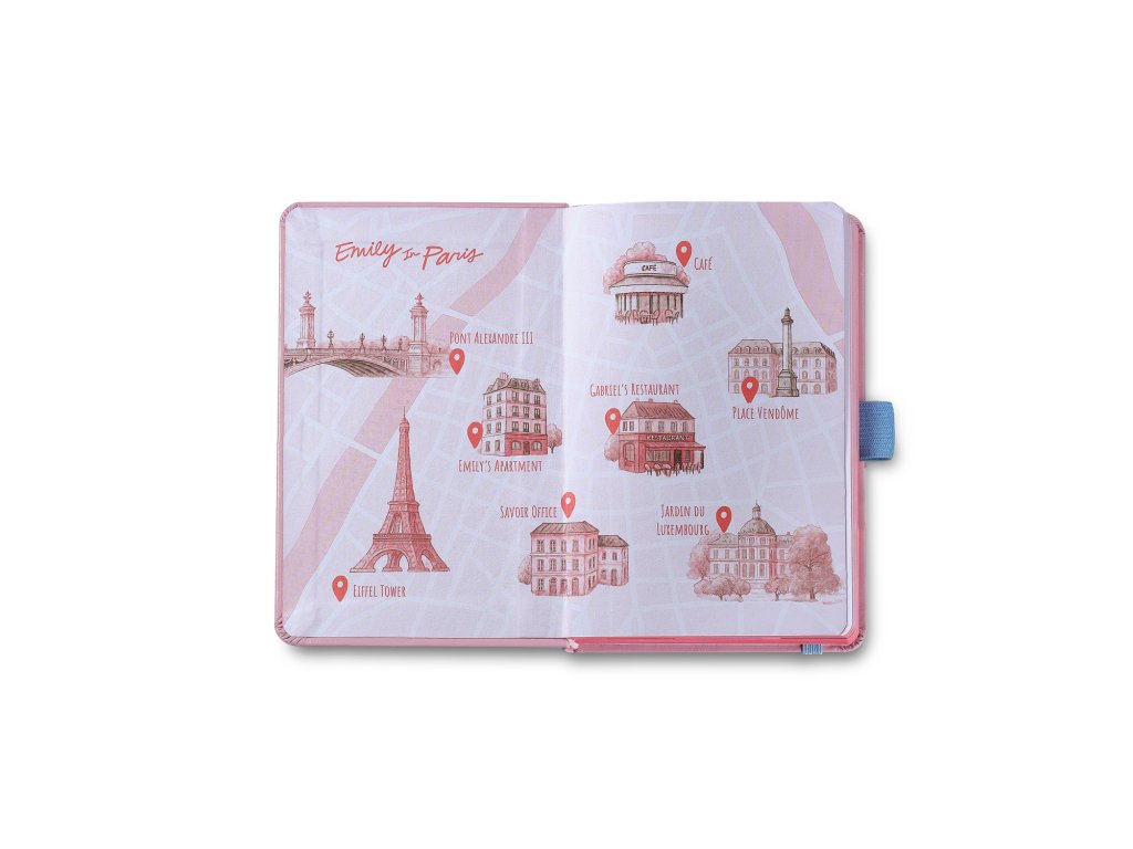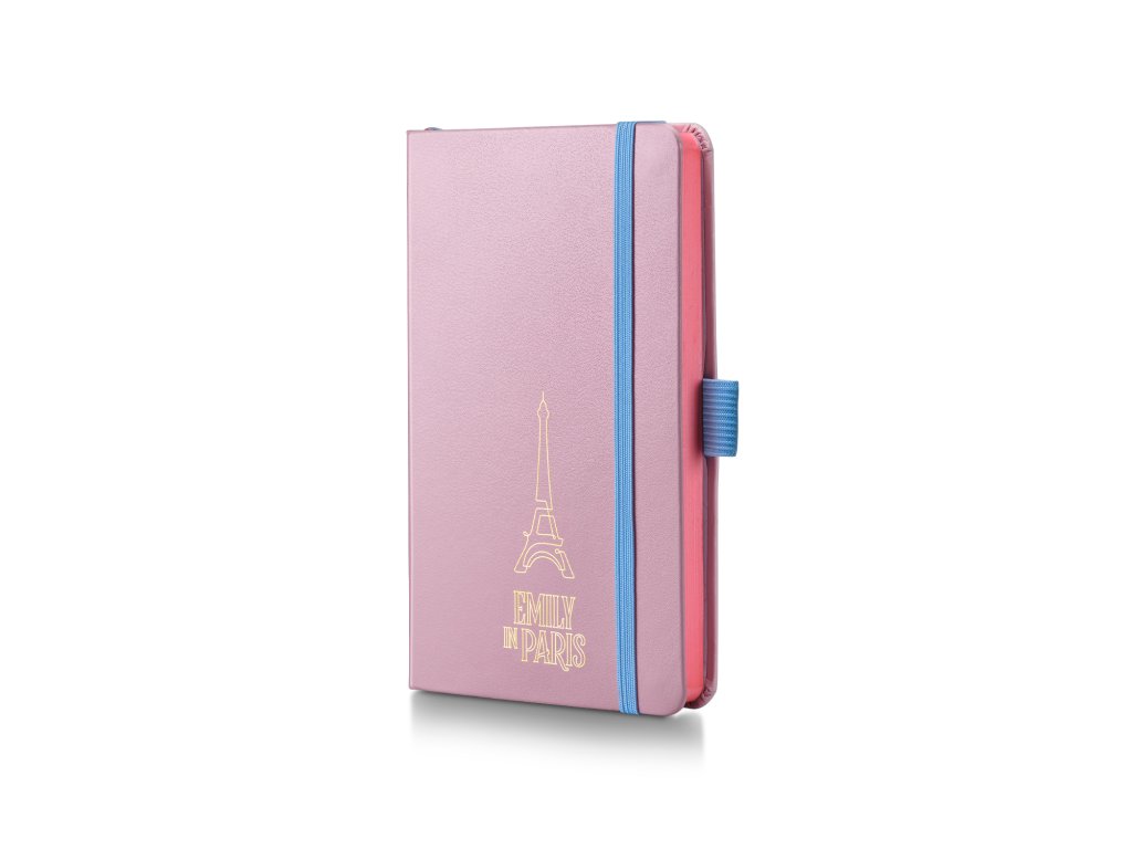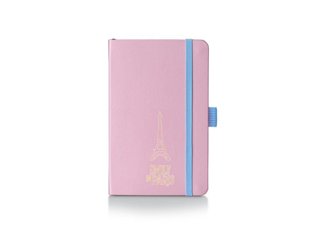 - Desky zdobí zlatý fóliový potisk s monogramem Emily in Paris a Eiffelovy věže