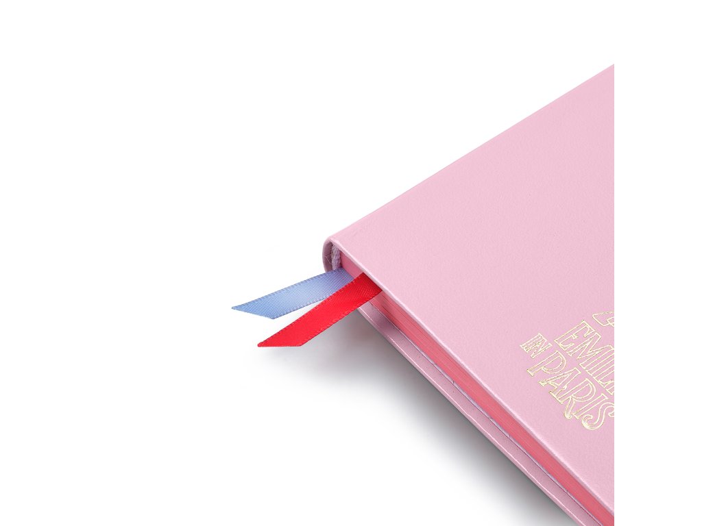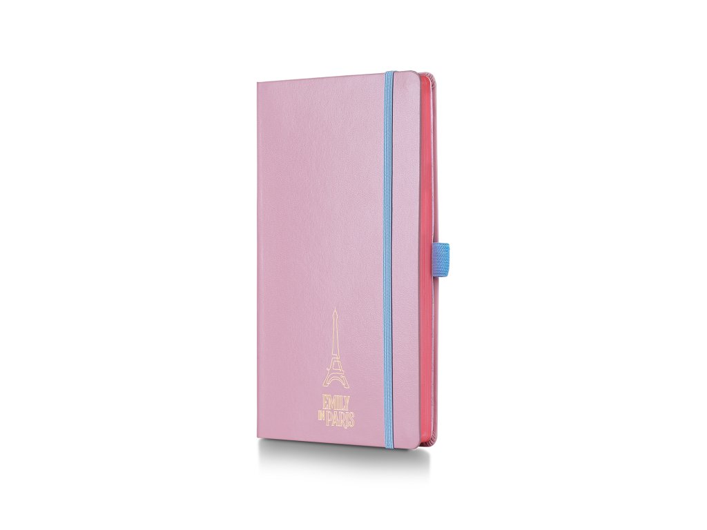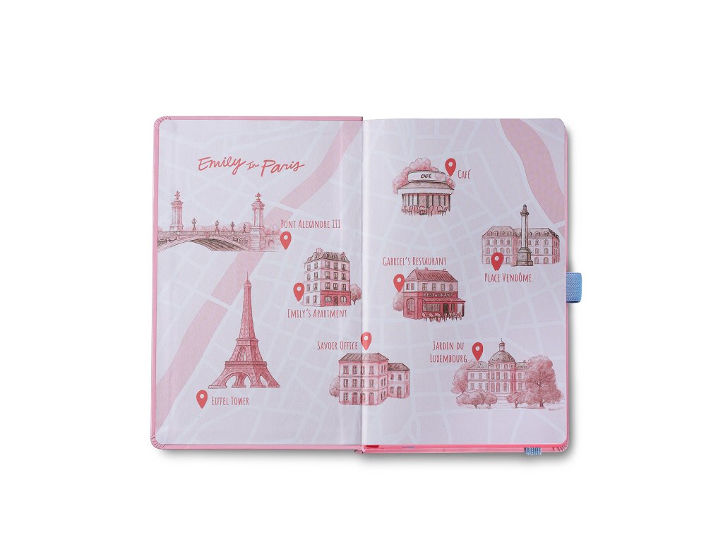 - Desky zdobí zlatý fóliový potisk s monogramem Emily in Paris a Eiffelovy věže