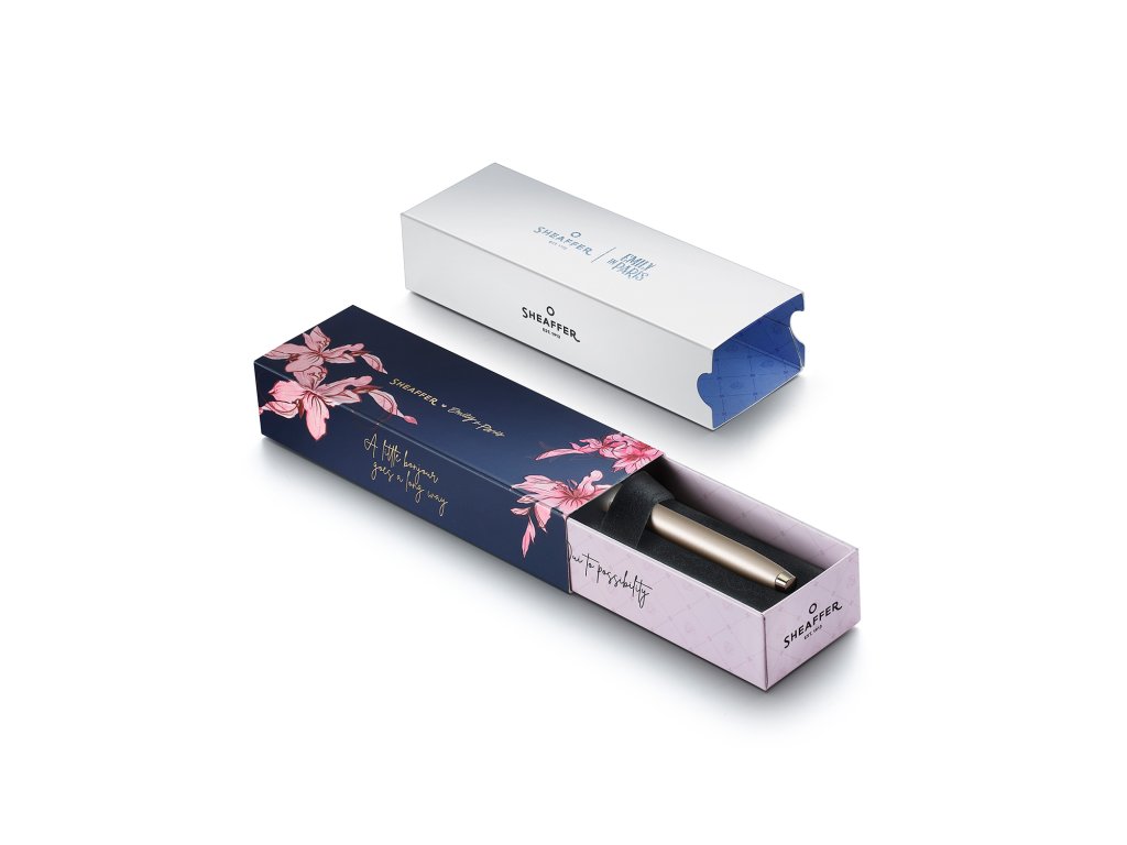 Charakteristickým prvkem je mašlička na klipu, která hravě odkazuje na Emilyin módní podpis. Co-brandovaný středový kroužek s motivem Emily in Paris dodává peru sběratelský nádech a dělá z něj skvělý kousek pro fanoušky seriálu i milovníky značky Sheaffer.